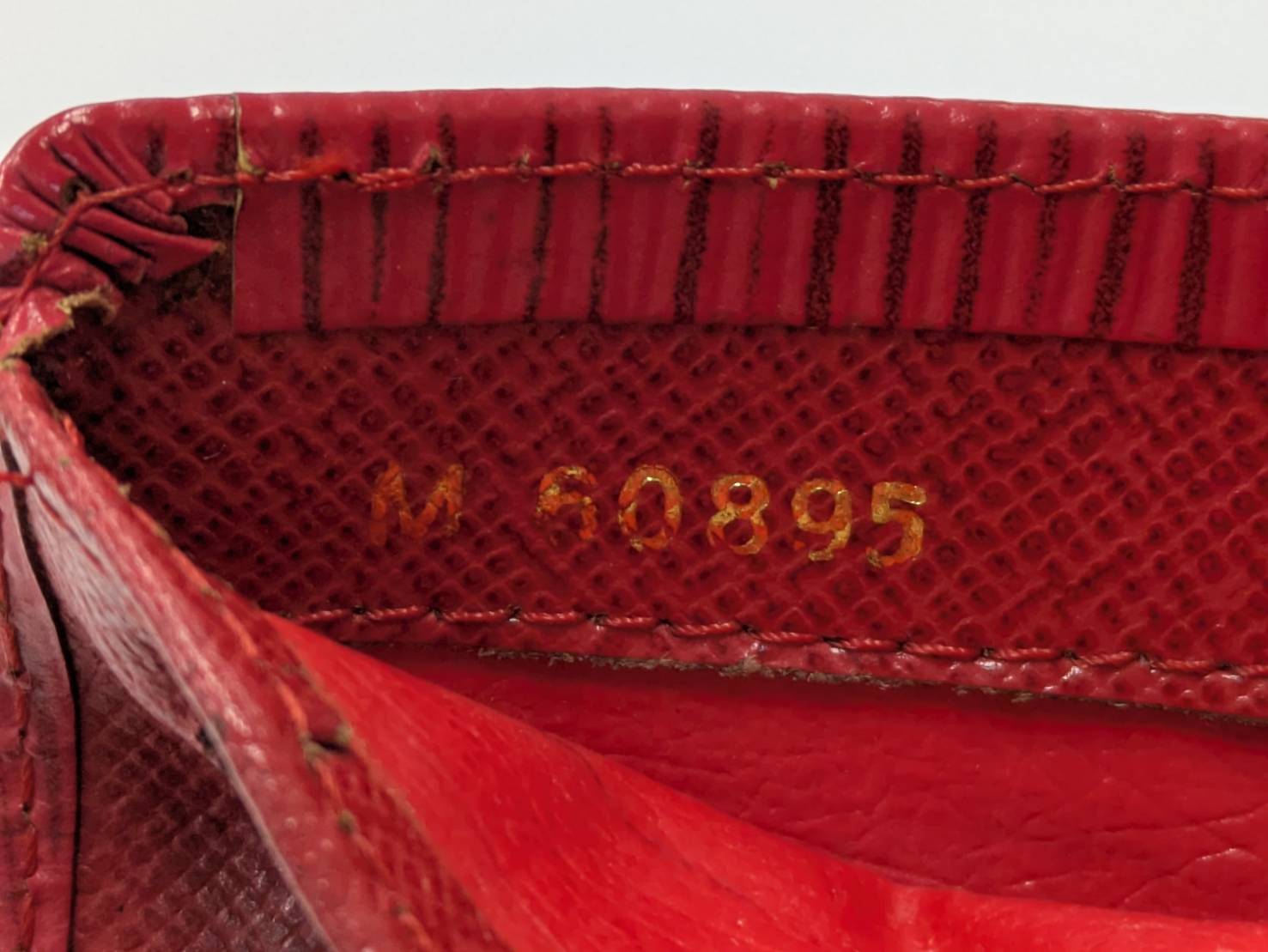 この基準外品には「M60895」と箔押しされていましたが、これは一目で基準外品と判断できる特徴です。昔に製造された基準外品の中には、なぜか商品の型番が製造番号のように刻印されているケースが見受けられます(しかも、その型番がその財布のものではないこともあります)。当時は製造番号の仕組みがまだ十分に理解されていなかったのかもしれません。