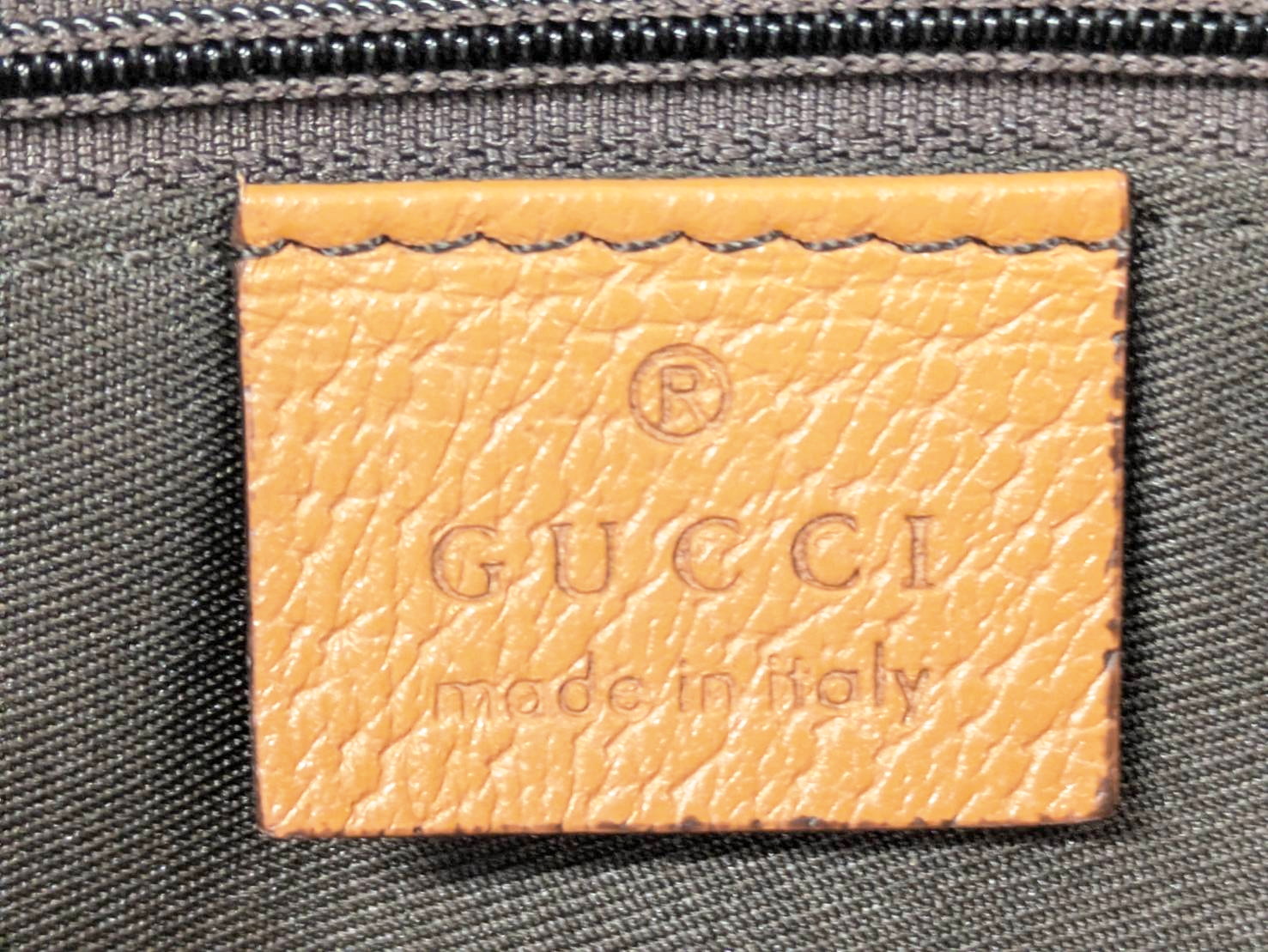 内側タグの「GUCCI」ロゴに注目してください。特に「U」の文字は、正規品では左右の縦線に微妙な太さの違いがありますが、基準外品は左右の太さが完全に同じになっています。正規品の繊細な字体を再現できていません。