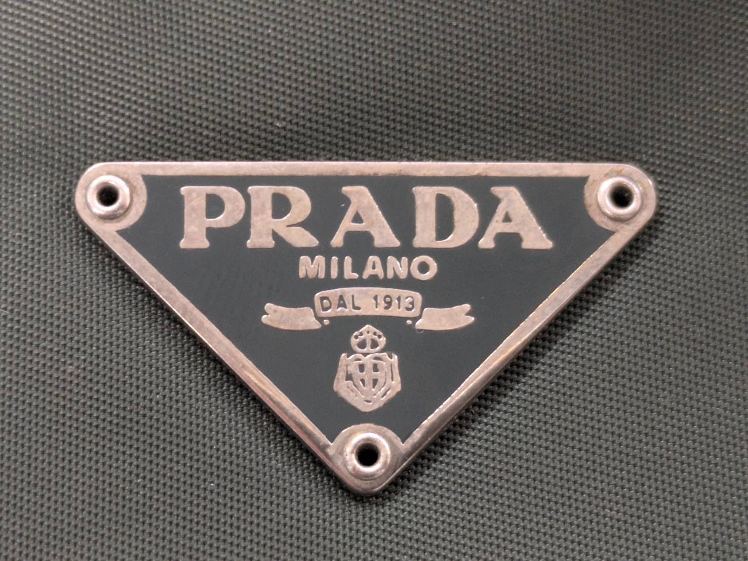 正規品の三角プレートは精密に作られており、PRADA の文字や紋章のディテールまで美しく仕上げられています。しかし、基準外品では字体が歪んでいたり、紋章の細部が潰れていたりと、作りの粗さが目立ちます。特に紋章のロープ部分や王冠の細かい装飾が雑に作られているのが特徴です。