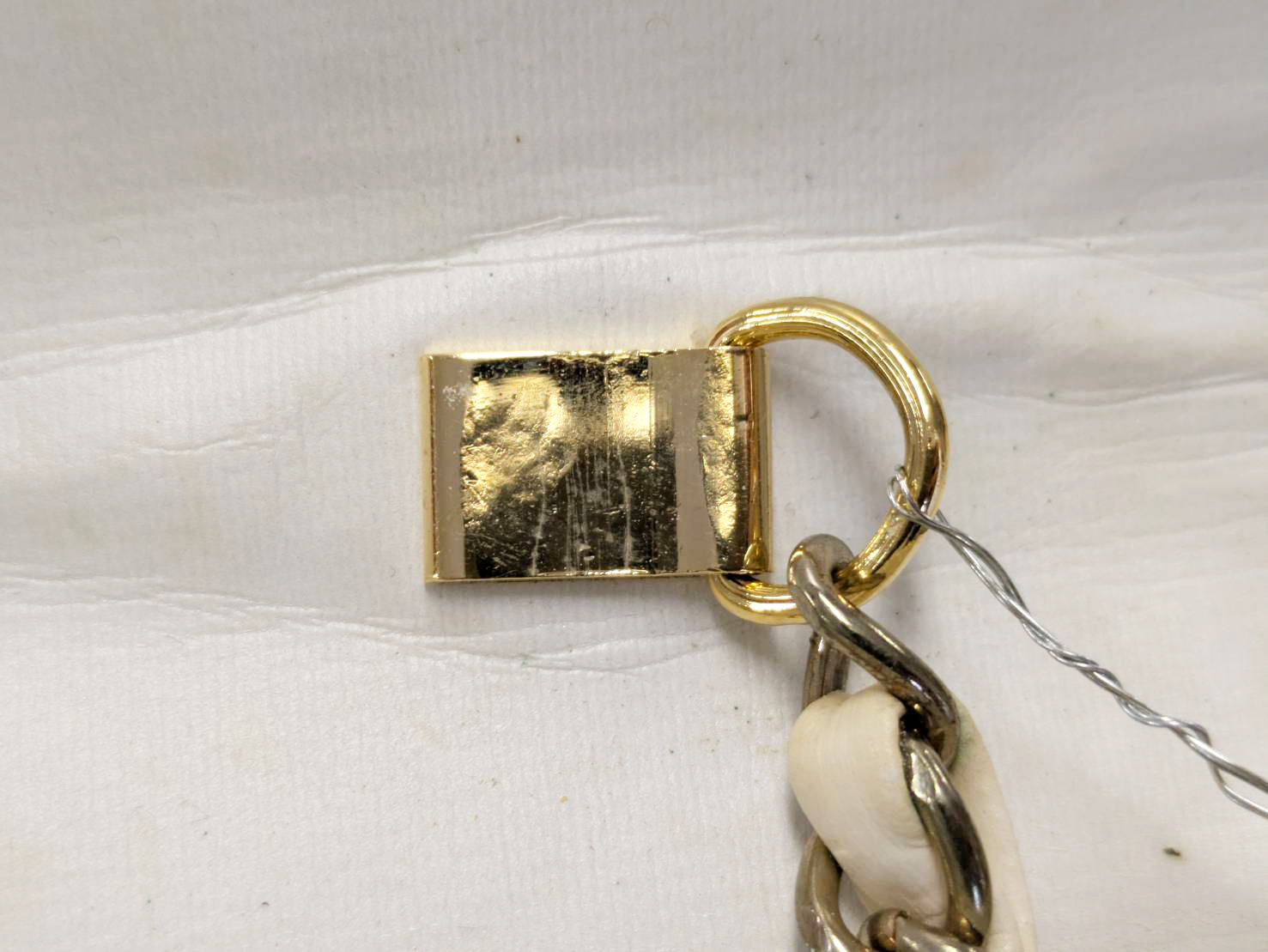 正規品は金具のメッキ処理が均一で美しい光沢を持っていますが、基準外品はメッキにムラがあり、色味が不自然です。また、メッキの厚みが薄く、すぐに剥がれやすい傾向があります。金具の仕上げも粗く、バリや研磨の甘さが目立ちます。