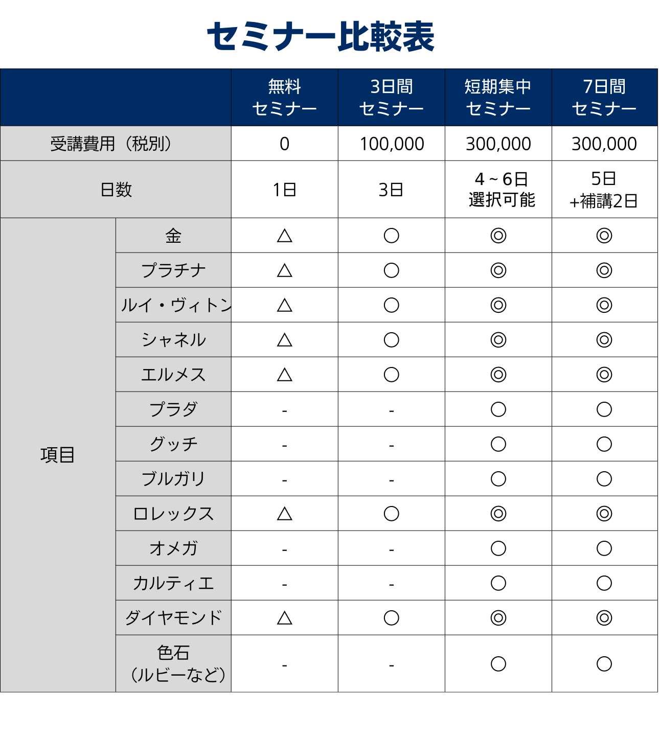 ブランド品、貴金属、宝石、時計の買取につながる内容が主となります。 真贋鑑定から相場について学べます。